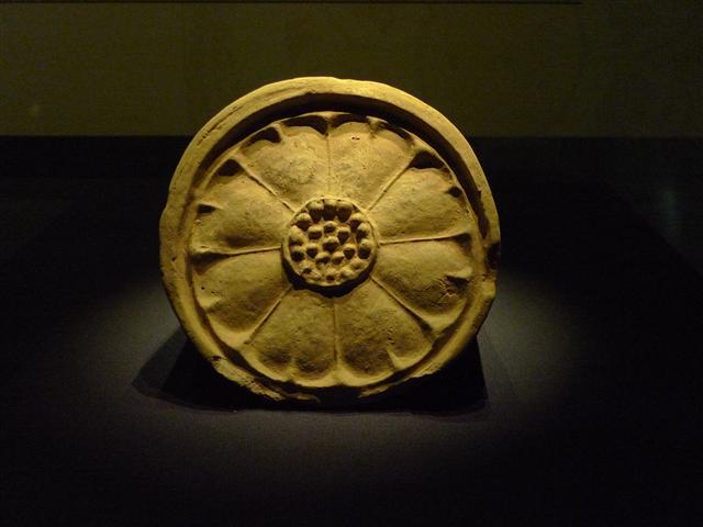 ▲ 익산 왕궁리유적전시관에 전시돼 있는 백제 말기 유물인 '8엽 단판연화문수막새'.