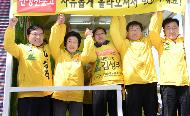 민주통합당 한명숙 대표가 6일 전주 상산고등학교 사거리를 찾아 이상직·김성주·김춘진·김윤덕 후보와 함께 유세를 펼치고 있다.