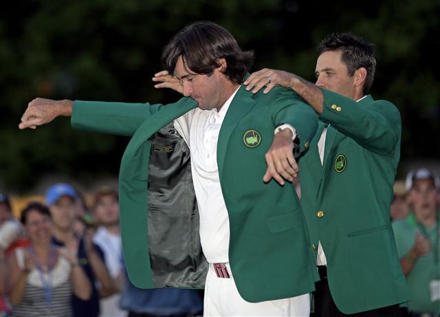 '장타자' 버바 왓슨(34·미국)이 美남자프로골프(PGA) 투어 시즌 첫 메이저 대회인 마스터스 토너먼트의 그린재킷 임자가 됐다. 8일(현지시간) 조지아주 오거스타 내셔널 골프장의 마스터스 마지막 4라운드 10번홀의 연장 2차전에서 루이 우어스티즌(30·남아공)을 극적으로 꺾고 우승한 왓슨이 칼 슈와첼(남아공)의 도움을 받으며 승리의 재킷을 입고 있다.