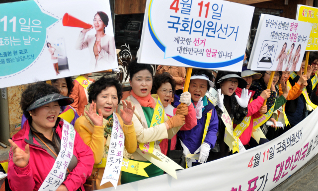 9일 전주 중앙시장 앞에서 전주시여성단체협의회 회원들이 4·11총선에 앞서 투표율을 높이기 위한 공명선거 캠페인을 벌이고 있다.