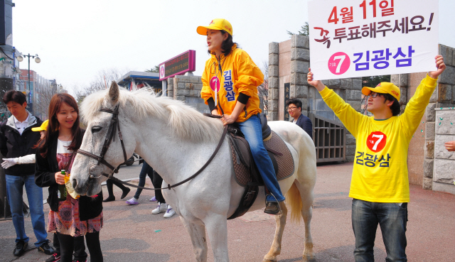전주 완산갑 김광삼 무소속 후보 배우자인 한정아씨가 9일 전북 대학교앞에서 백마를 타고 투표 참여를 호소하며 이색 선거유세를 펼치고 있다.