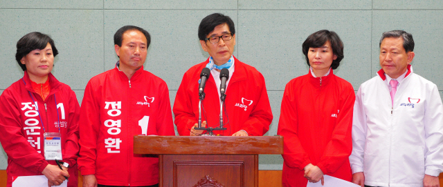 10일 전북도의회 브리핑룸에서 새누리당 태기표 선대본부장을 비롯한 후보, 의원들이 새누리당 지지를 호소하고 있다.