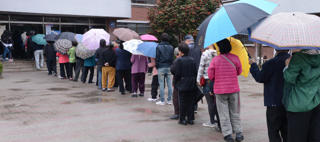 비가 내린 11일 오전 19대 총선 전주 평화1동 제2투표소에서 유권자들이 우산을 쓰고 투표 차례를 기다리고 있다.