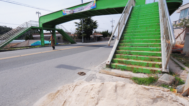12일 오후 김제시 백구면 백구교회 앞 도로. 육교로 올라가는 입구에는 모래가 쌓여 있어 진입조차 할 수 없었고 보행자들은 횡단보도가 없는 왕복 4차선 도로를 위험하게 무단횡단하고 있었다. 0또 육교가 인도를 가로막아 보행자들은 차도를 이용해 육교 인근을 통행하고 있었다.