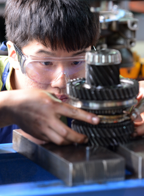 제42회 전라북도기능경기대회가 12일 전주공고에서 열려 자동차정비부문에 출전한 한 선수가 엔진 조립에 심혈을 기울이고 있다.