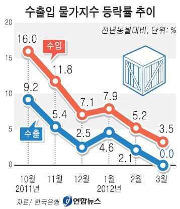 한국은행이 지난 16일 발표한 '수출입 물가지수'를 보면 올 3월 수입물가 상승률은 전년 동월보다 3.5% 오르는 데 그쳤다. 이는 2010년 3월 -4.3% 이후 최저치다.
