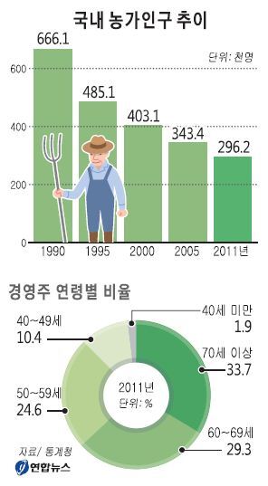 인구 고령화 속도가 빨라지면서 농·어가 인구가 계속 줄고 있다. 이에 따라 전체 인구에서 이들이 차지하는 비중도 하락하고 있다. 통계청은 17일 2011년 농림어업조사 결과를 발표했다.