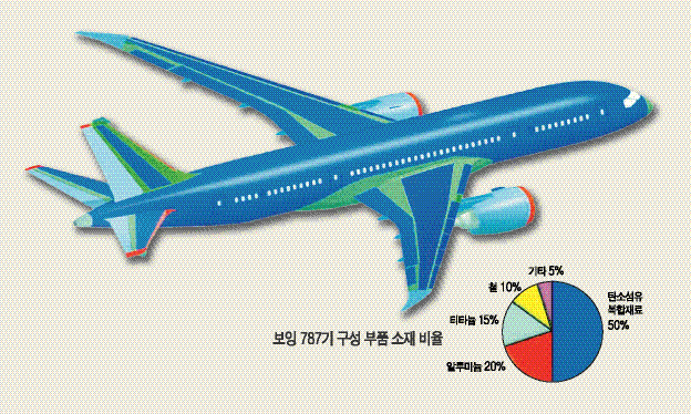 △항공·우주 분야 = 세계적 항공기 제조회사인 보잉사는 주 날개, 동체, 중앙 날개 등 구조부품의 50%를 탄소섬유복합재료를 적용한 보잉-787기를 생산하고 있다.