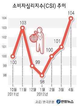 지난 25일 한국은행에 따르면 4월 CSI는 3포인트 오른 104로 4개월 연속으로 상승했다. /연합뉴스