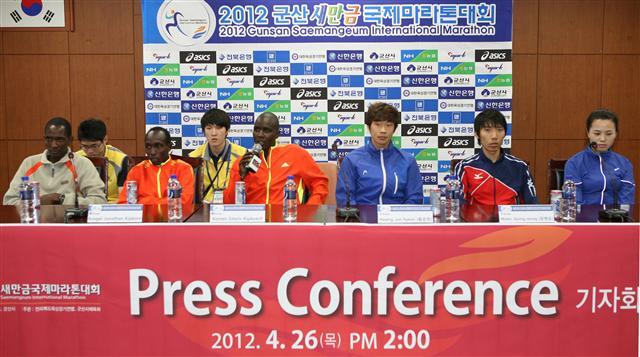 '2012 군산새만금 국제마라톤 대회' 참가 선수들로부터 이번 대회에 임하는 각오와 필승을 다짐하는 기자회견이 각 언론사와 대회 관계자 선수 등이 참석한 가운데 26일 군산시청에서 열렸다.