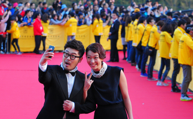 ▲ "우리도 인증샷" 26일'제13회 전주국제영화제'의 개막식에 참석한 배우 김기방·정애연씨가 카메라 기자들을 향해 스마트폰을 들고 인증샷 포즈를 취하고 있다.