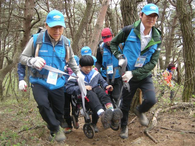 이날 휠체어를 탄 장애인 팀에는 많은 자원봉사자들과 산악인들이 배치됐다. 산행 코스가 만만치않아, 체력소모가 심해질 수 있기 때문이다. 이들은 교대로 휠체어를 당기고 밀었고, 휠체어가 나아갈 수 없는 길에서는 번쩍 들어 올렸다.