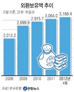 2일 한국은행에 따르면 4월 말 현재 우리나라 외화보유액은 3천168억4000만 달러로 전월 말보다 8억9000만 달러 증가했다.