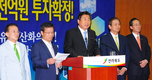 ▲ 지난해 6월14일 전북도청에서 김완주 지사, 송하진 전주시장 등과 함께 이상운 (주)효성 대표이사가 전주에 1조2000억원을 투자해 탄소섬유 생산공장을 건립겠다고 발표하고 있다. 전북일보 자료사진