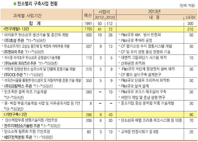 탄소밸리 사업의 저가형 T-300급 개발과 (주)효성의 T-700급 탄소섬유와 연계해 오는 7월 정부의 예비타당성조사 대상사업으로 신청하기 위해서다. 이른바 '제2의 탄소밸리사업'으로 2014년부터 5년간 3000억원이 투입되는 '초고강도 탄소복합체 개발사업'을 겨냥한 것이다.