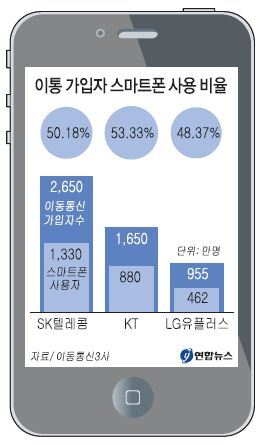 KT 가입자 1천650만명 중 53.33%인 880만명이, LG유플러스의 가입자 955만명 중48.37%인 462만명이 스마트폰 사용자였다.