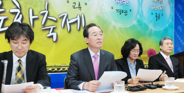 ▲ 14일 전주시청 브리핑룸에서 송하진 전주시장이 전주 아시아태평양 무형문화유산축제를 비롯한 6월 문화축제에 대한 기자회견을 갖고 있다. 추성수기자chss78@