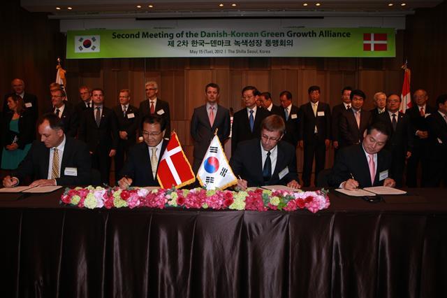 ▲ 15일 이건식 김제시장(왼쪽에서 두번째)과 송영선 진안군수(맨 오른쪽)가 서울 신라호텔에서 덴마크 프레데릭 왕세자 및 김황식 국무총리 등이 참석한 가운데 덴마크 도축전문업체·부산물 처리업체와 각각 MOU를 체결했다.
