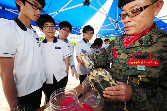 16일 전주 덕진공원에서 열린 생태계 보전을 위한 외래어종 퇴치행사에서 해병대전우회 관계자가 학생들에게 붉은귀거북의 생김새를 설명하고 있다.