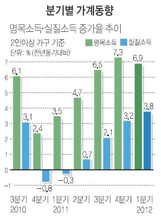 통계청이 18일 발표한 1분기 가계동향을 보면 가구당 월평균 소득은 412만 4천원으로 전년 동기 대비 6.9% 증가했다. 소비자물가 상승분을 제외한 실질 소득은 3.8% 늘어났다. /연합뉴스