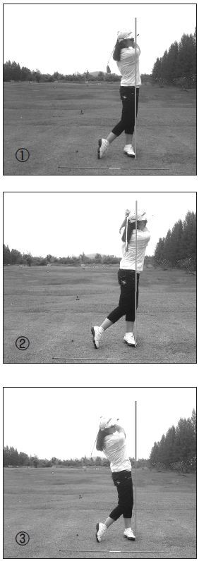 사진 3의 동작은 회전이 오히려 진행하는 반대방향으로 이루어진 것이다. 이 동작은 뒷땅을 많이 만들어 내며, 볼의 탄도가 높아져 거리의 손실이 크다. 체중이동도 원활하지 못해 클럽헤드 스피드가 주는 것은 당연하다.