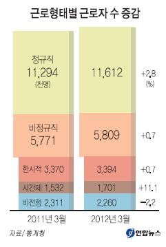 24일 통계청이 발표한'3월 경제활동인구조사-근로형태별 부가조사 결과'를 보면 임금근로자는 1742만1000명으로 작년 같은 달에 비해 35만6000명(2.1%) 늘었다. /연합뉴스