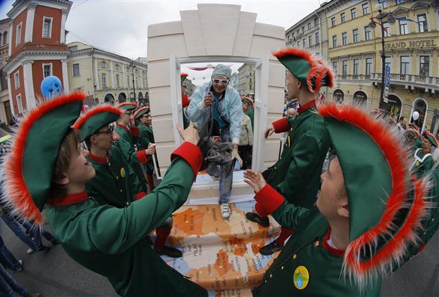 26일(현지시간) 러시아의 상트페테르부르크에서 도시건설 309주년을 맞아 시민들이 '유럽의 창' 축하행사를 하고 있다. '유럽의 창'은 러시아를 유럽제국으로 만들려는 야망에 불탔던 표트르1세에 의해 건설된 이 도시를 묘사할 때 흔히 쓰는 용어다. /AP=연합뉴스