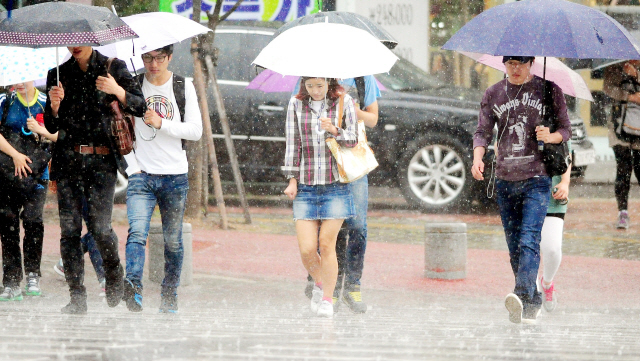 천둥과 번개를 동반한 비가 내린 30일 전북대학교 정문에서 학생들이 굵은 빗줄기를 피해 발걸음을 옮기고 있다. 31일은 전국이 대체로 흐리고 오후에는 대부분 지방에 비가 오는 곳이 많겠고 중부지방에는 돌풍이 부는곳도 있겠다고 기상청이 예보했다.