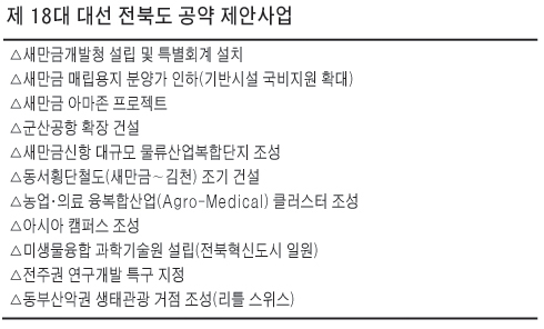 이와함께 새만금 지역에 대규모 숲을 조성하는 '아마존 프로젝트'와 '새만금 신항만 대규모 물류산업복합단지 조성'계획도 공약 제안사업에 포함됐다.