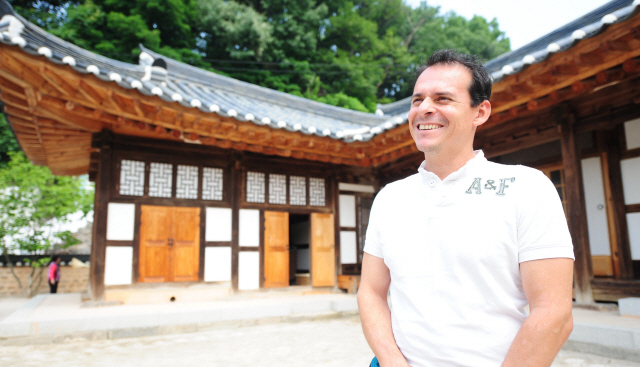 지난 30일 전주 한옥마을 내 동헌에서 만난 '카레타' 장인 제라드 알바르도(42). 코스타리카에서도 손에 꼽는 이 '젊은' 장인은 "수레 만들 도구가 아직 도착을 안해서 아쉽다"고 운을 뗐다.