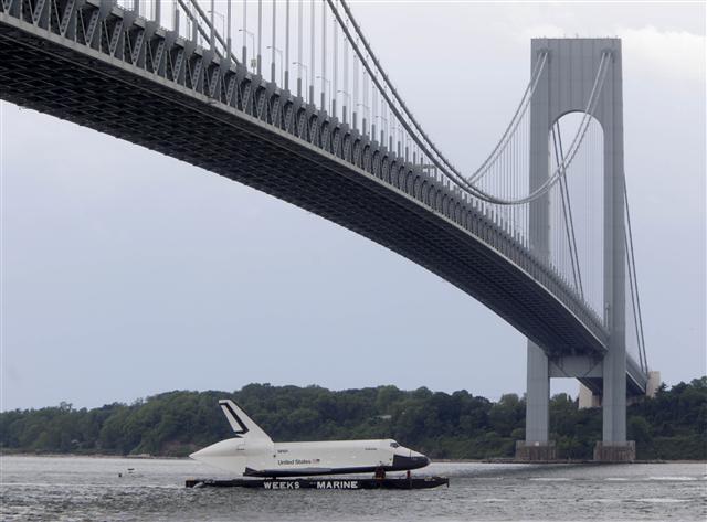 미국 우주왕복선 초창기 모델인 엔터프라이즈호가 바지선에 실려 마지막 정착지인 맨해튼의 인트레피드 해양항공우주 박물관으로 이동중 3일(현지시간) 뉴욕 베라사노-내로우스 다리 밑을 통과하고 있다. /AP=연합뉴스