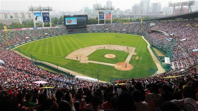 프로야구가 역대 최소 경기만에 300만 관중을 돌파한 가운데 6일 오후 관중들이 잠실야구장에서 SK와 두산의 경기를 보며 열띤 응원을 하고 있다.