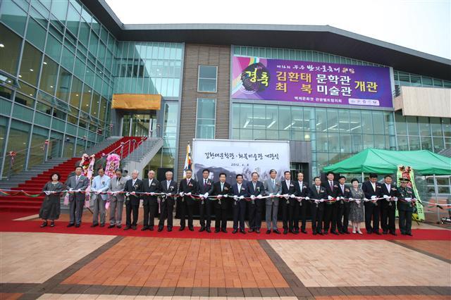 김환태문학관·최북미술관 개관식이 지난 8일 무주읍 당산리 반딧골 전통공예문화촌 앞 광장에서 홍낙표 무주군수를 비롯한 전북문인협회 정군수 회장과 김남곤 전북일보 사장(시인), 전주미술협회 김삼열 지부장 등 문학 및 미술계 인사 등 400여명이 참석한 가운데 열렸다.