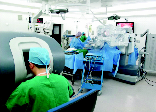 ▲ 최근 3대 암 수술 사망률 평가에서 1등급을 받은 원광대병원 의료진이 로봇수술을 하고 있다.