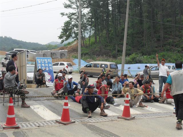 ▲ 11일 태권도공원조성사업 공사 현장 입구에서 근로자 50여 명이 체불임금지급을 요구하며 농성에 들어갔다.