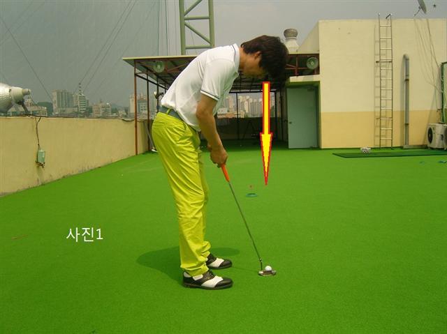 오늘은 공의 위치를 바르게 하는 방법에 대해서 이야기해보자. 방향, 거리, 스피드를 정확히 하더라도 얼라이먼트를 제대로 하지 못하면 이 또한 성공률을 떨어트리는데 많은 영향을 준다. 사진1은 바른 얼라이먼트 자세를 바르게 취한 자세이다. 공이 지나가는 라인과 눈이 같은 라인 선상에 있어야 바른 얼라이먼트라 할 수 있다. 즉 눈과 볼의 위치가 일치해야 시각차이를 줄여 퍼팅 성공률을 높일 수 있는 것이다.