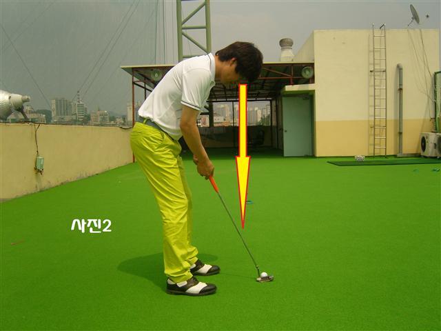 사진2는 몸과 공이 너무 멀어서 눈과 볼이 일치 되지 않은 경우이다. 이 경우 눈과 볼의 시각차이가 생겨 바르게 스트로크를 해도 볼이 홀컵 방향으로 똑바로 가지 않고 시각차이가 보이는 방향으로 굴러가게 된다. 사진3은 볼이 몸에 너무 가까이에 있어서 눈 안쪽으로 라인이 생기게 되고, 이 또한 볼 라인과 눈 라인의 시각차가 생겨 볼이 원하는 방향으로 굴러가지 않게 된다.
