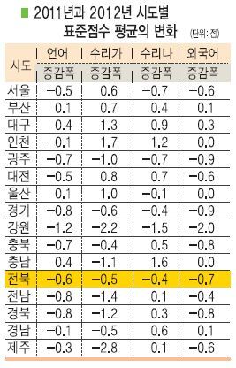 도내 수험생들의 표준점수 평균 변화(2011년→2012년)는 전국 평균 언어 -0.43점, 수리가 -0.23점, 수리나 -0.03점, 외국어 -0.437점과 비교해도 감소 폭이 크다.