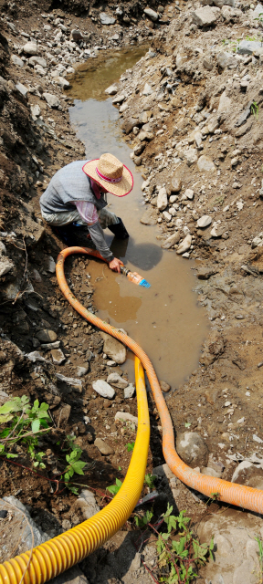초여름 가뭄이 지속되는 가운데 13일 완주군 구이면 안덕리 장파마을에서는 막바지 모내기를 위한 양수작업이 한창이다. 메마른 하천에 구덩이를 파서 생긴 고인물을 농민이 양수기로 퍼올려 논에 대고 있다.