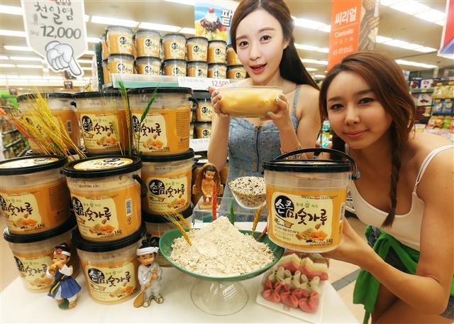 롯데마트가 19일 오전 중구 봉래동 서울역점에서 가루가 아닌 물에 잘 녹는 과립형으로 현미, 보리, 율무 등 20가지 국산 곡물만을 사용해 만든 손큰 미숫가루 1kg 1통을 12,500원에 선보이고 있다. 연합뉴스