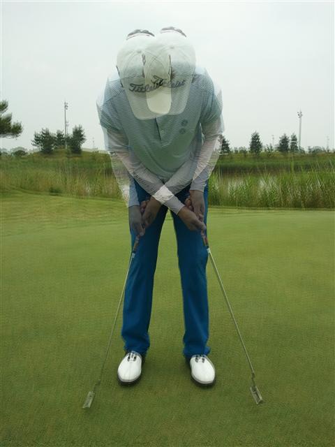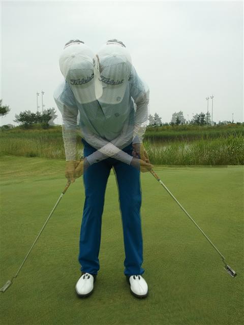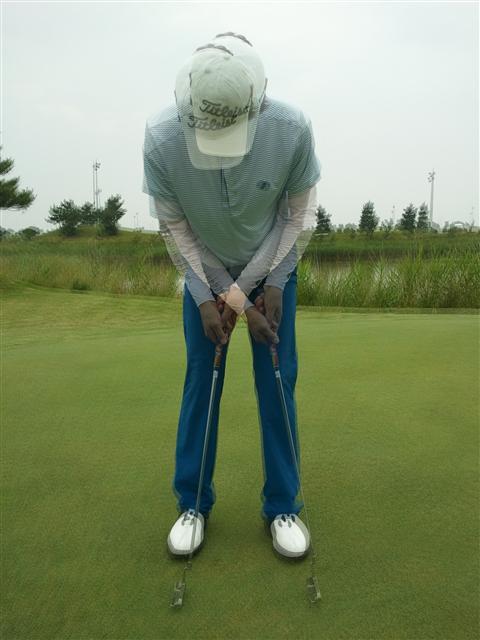 사진2는 퍼터 헤드가 오른발을 지나갔을 때를 나타낸다. 이정도 스윙이면 필자의 경우 8걸음을 굴러간다. 참고로 필자는 몇 m굴러가는가를 보는 것보다는 몇 걸음을 굴러 가는지로 익혀두다. 그렇게 하면 거리측정을 정확하게 할 수 있으며, 정확한 거리감은 퍼팅의 자신감을 만들어 내는 것이다. 최소 단위 거리를 익히는데, 많은 골퍼들은 3걸음, 5걸음, 8걸음, 10걸음으로 거리를 익히고 있다.
