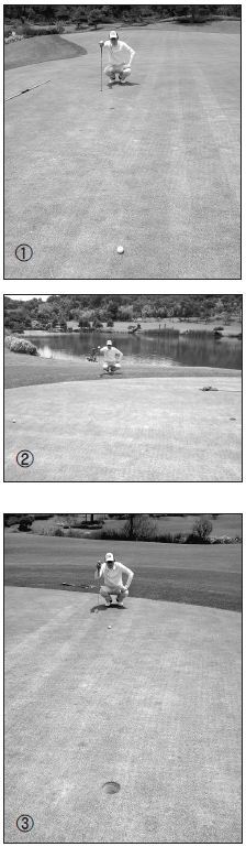 정확한 정보를 파악하기 위해서는 다리품을 많이 팔아야 한다. 즉 그린의 라이를 읽기 위해서 많이 움직여야 한다는 것이다. 사진1은 홀컵을 기준으로 볼 뒤에서 라이를 읽는 장면이다. 라이를 바르게 읽기 위해서는 꼭 눈의 높이를 지면과 가깝게 낮춰야 하는데, 이는 사진과 같이 앉은 자세로 라이를 읽으면 충분히 보이게 된다.
