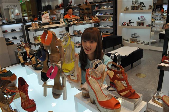 ▲ 롯데백화점 전주점 1층 구두매장에서 직원이 앵글스트랩 샌들을 보여주고 있다.