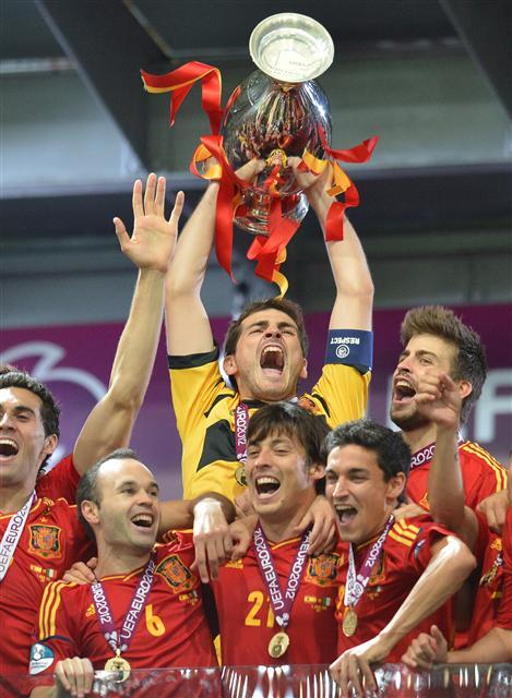 스페인은 2일 새벽(한국시간) 우크라이나 키예프의 올림픽 스타디움에서 열린 이탈리아와의 결승전에서 전반 14분 다비드 실바(멘체스터 시티)의 결승골을 시작으로 전반 41분 호르디 알바(발렌시아)의 추가골, 후반 39분 페르난도 토레스(첼시)의쐐기골과 후반 43분 후안 마타(첼시)의 마무리골을 앞세워 4-0 완승을 했다. 2일(한국시각) 우크라이나 키예프 올림픽스타디움에서 열린 유로 2012 결승전에서 스페인은 이탈리아를 로 꺾고 대망의 우승컵을 차지했다. 주장 카시야스가 앙리들로네컵을 들어올리자 선수들이 환호하고 있다. /AP=연합뉴스