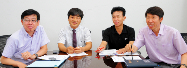 ▲ 지난 달 29일 전주 국제탄소연구서에서 열린 탄소산업 산·학·관·연 좌담회. 완쪽부터 (주)데크 박종현 전무이사, 곽이구 전주대 탄소나노부품소재공학과 교수, 최락휘 전주시 탄소산업과장, 안계혁 전주기계탄소기술원 연구개발본부장. 안봉주기자 bjahn@