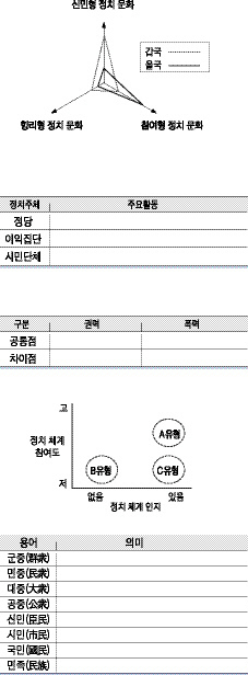 다음 그래프는 갑국과 을국의 정치 문화 유형을 나타낸 것이다. 두 국가의 정치 현상이 어떻게 나타날 것인가를 비교하고 문제점에 대한 해결책은 무엇이 있는가에 대하여 알아보자.