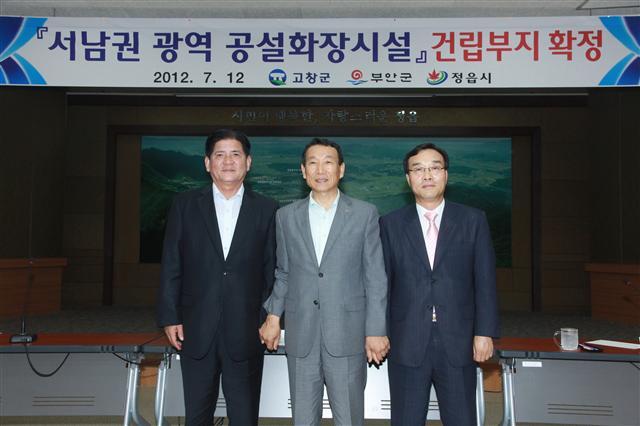 이와관련 김생기 정읍시장, 이강수 고창군수, 김호수 부안군수는 12일 정읍시청 대회의실에서 공동 기자회견을 갖고 "3개시군을 대상으로 4차례 공개모집을 거쳐 최종 후보지로 감곡면과 태인면이 경합을 펼쳤지만 현지실사및 서류심사를 거쳐 감곡면을 최종 선정했다"고 밝혔다.