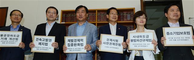 민주통합당 이용섭 정책위의장(왼쪽에서 두번째), 박기춘 원내수석부대표(왼쪽에서 세번째) 등 의원들이 12일 오전 국회 의안과에 경제민주화 실현을 위한 공정거래법 등 6개 민주화 관련 법안을 제출하고 있다. 연합뉴스