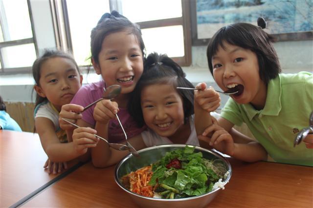 두 번째 보물은 싱싱하고 건강한 밥상과 채소를 좋아하는 아이들의 점심 식사 시간이다. 전교생이 갓 따온 오이와 상추, 호박을 넣고 비빔밥 체험행사까지 열었다.