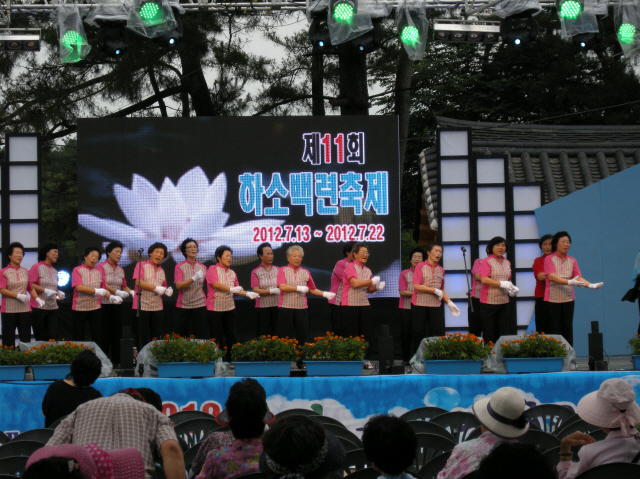 50세 이상 어르신들로 구성된 김제시 청하면 생활체육회 회원들이 음악에 맞춰 건강체조를 하고 있다.지난 13일 김제시 청하면 청운사 하소백련지 특설무대에서 개막한 제11회 하소백련축제가 10일간의 일정을 모두 마무리 하고 22일 성황리 막을 내렸다.